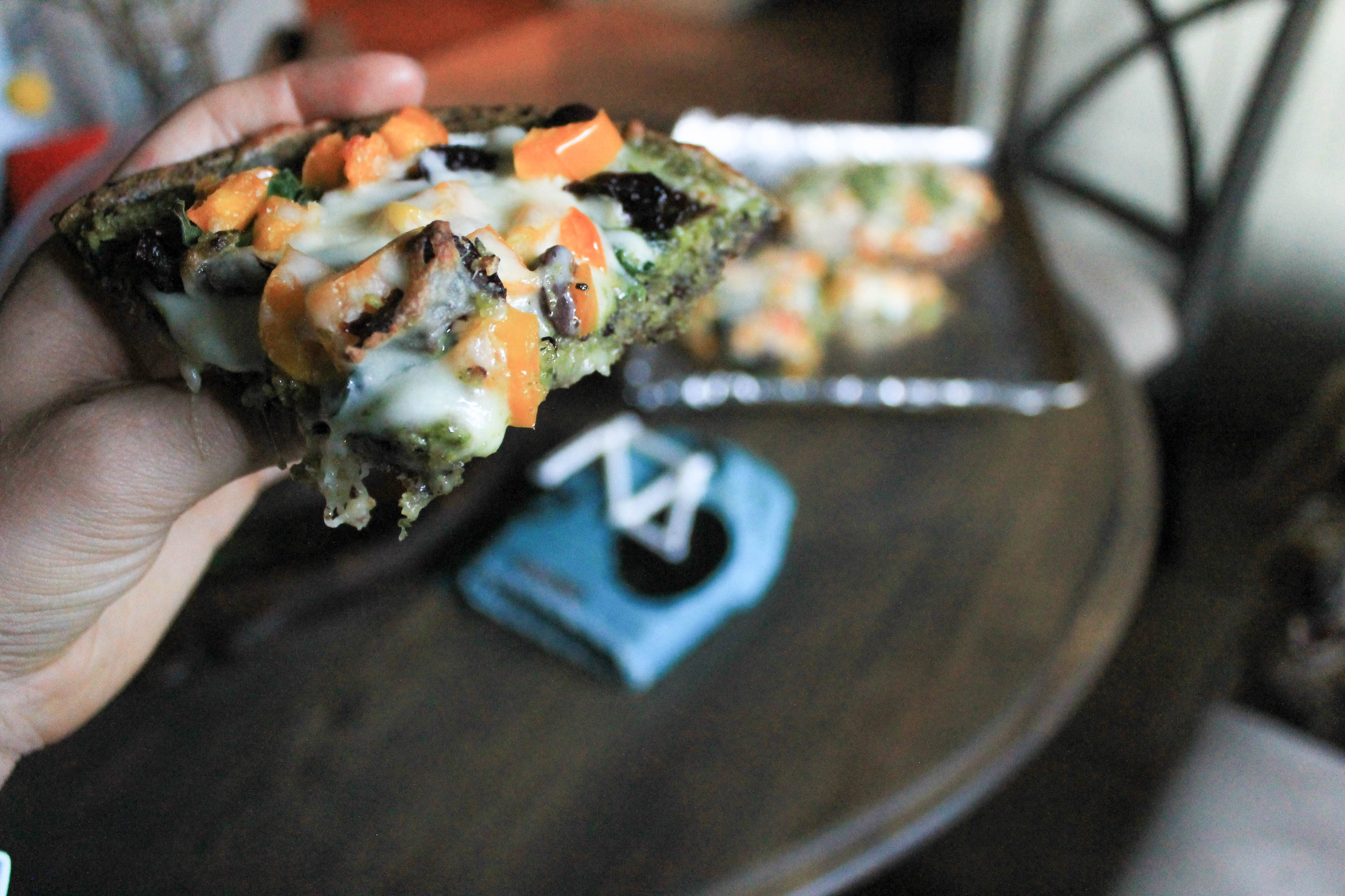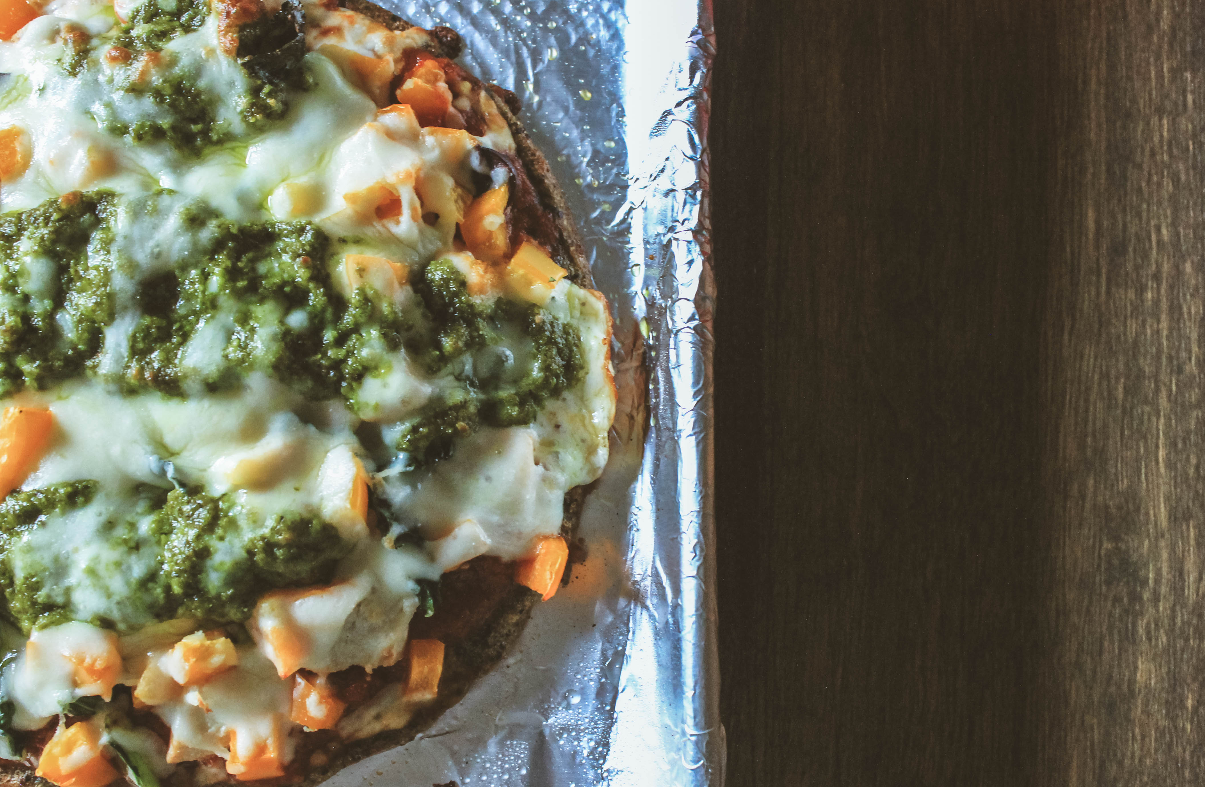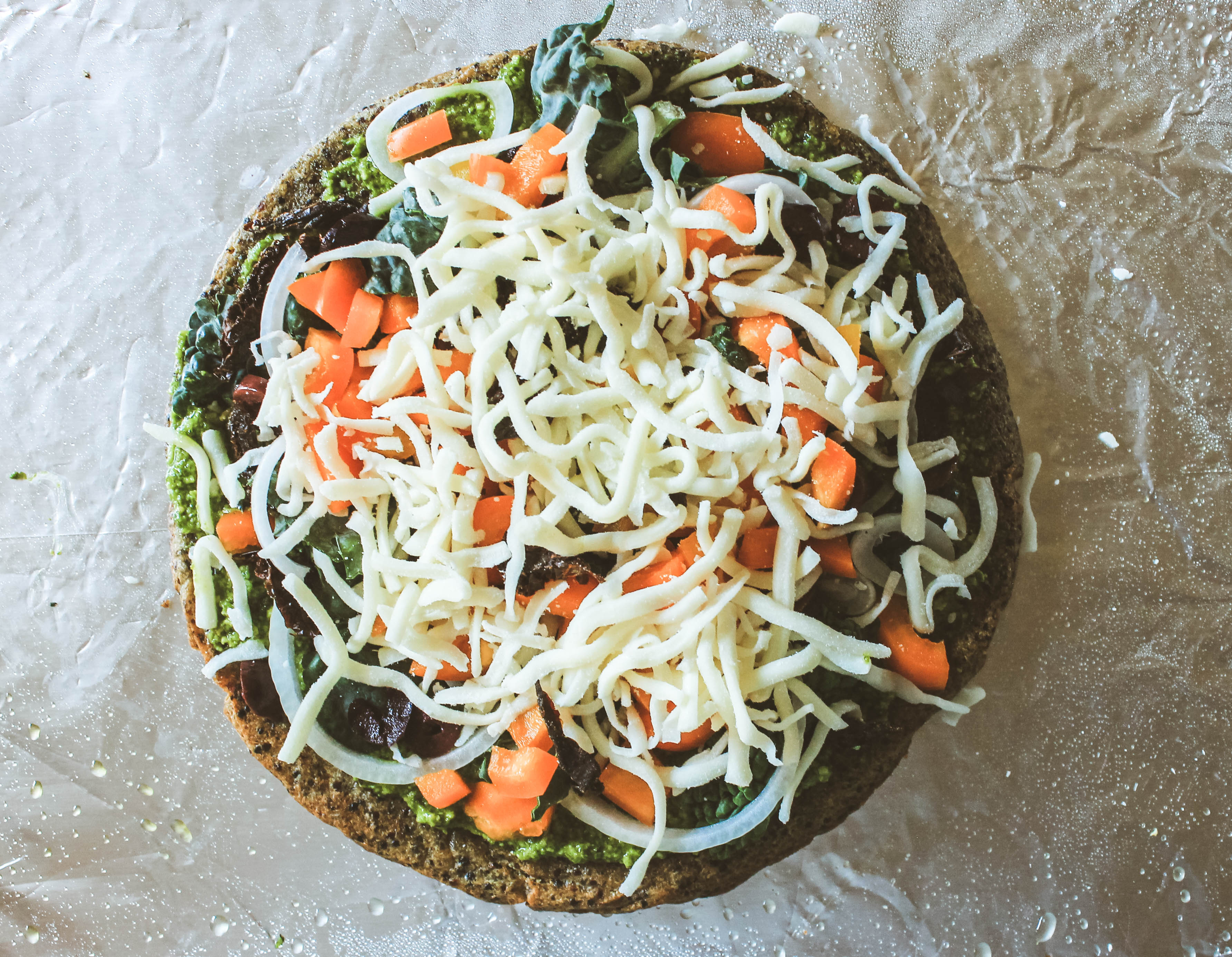 - Toppings: Shredded Chicken, Tuscan Kale, Sweet Onions, Black Olives, Orange Bell Peppers, Homemade Basil Pesto