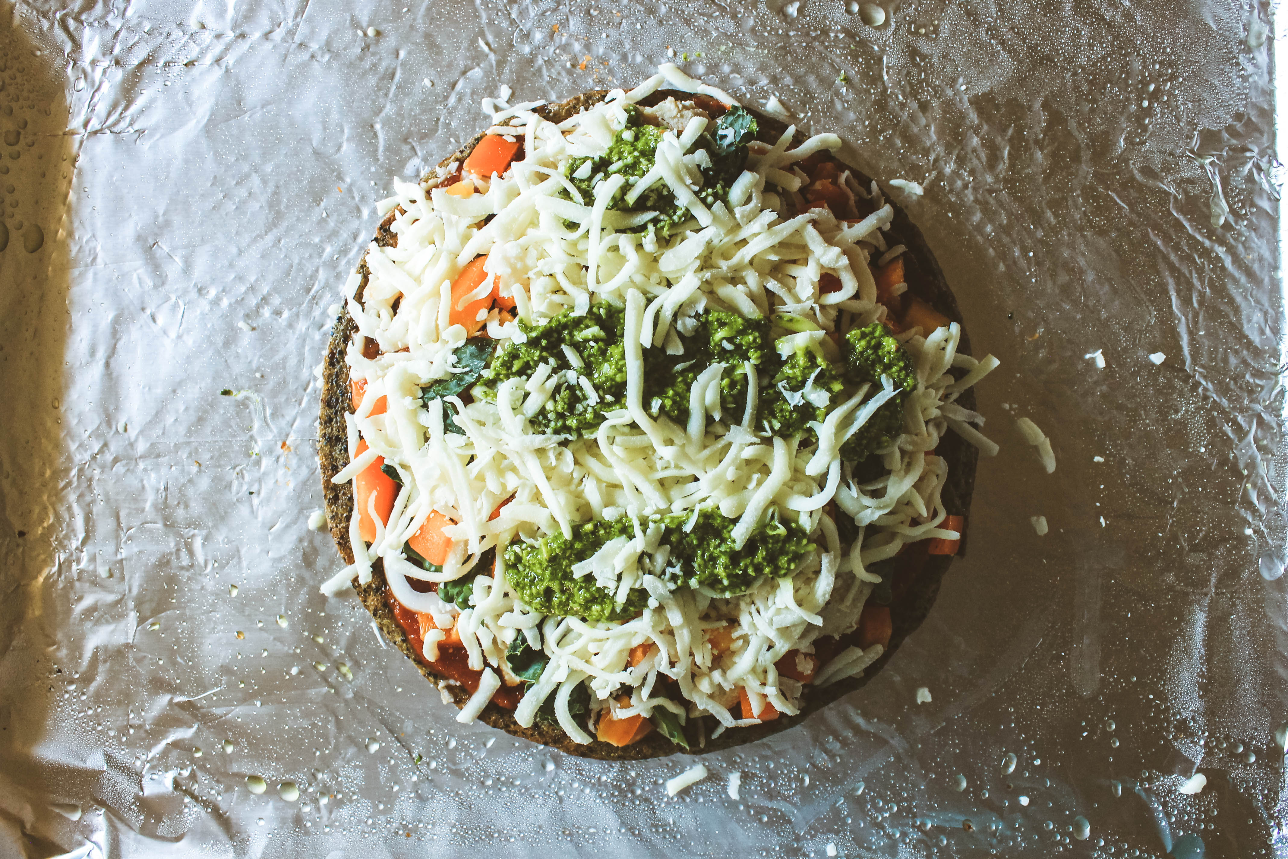 - Sauce: My Homemade Basil Pesto Make this by combining 2 cups of fresh, chopped basil, 5 TBS EVOO, ¼ cup grated Parmesan cheese, 2 TBS pine nuts, 2 tsp minced garlic, and ¼ tsp salt