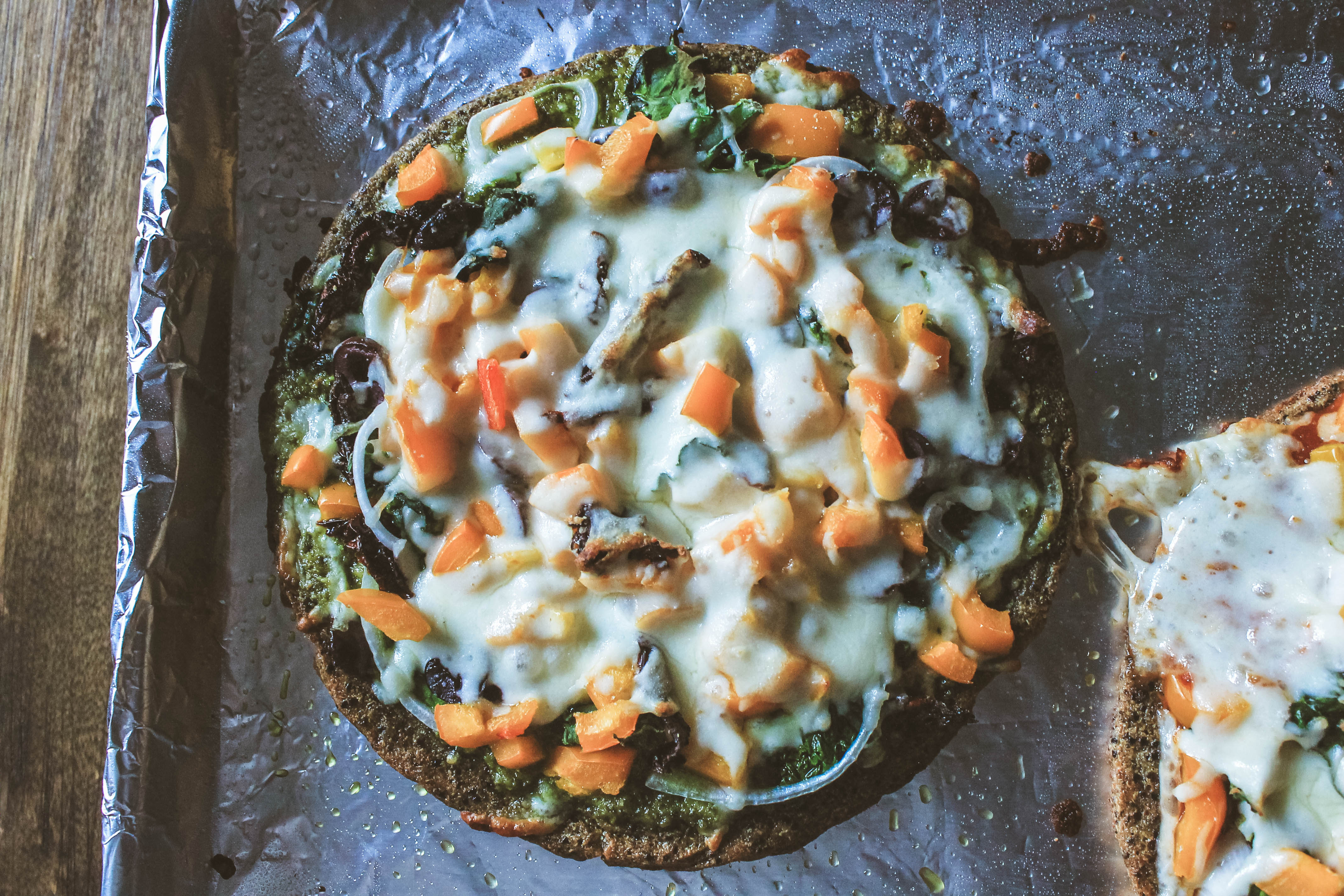 - • After 15 minutes, remove pan from oven and let sit for a few minutes. Flip crust on opposite side and return to oven for 12 - 15 minutes until crust is golden brown and edges are crispy. Chop your veggies now!