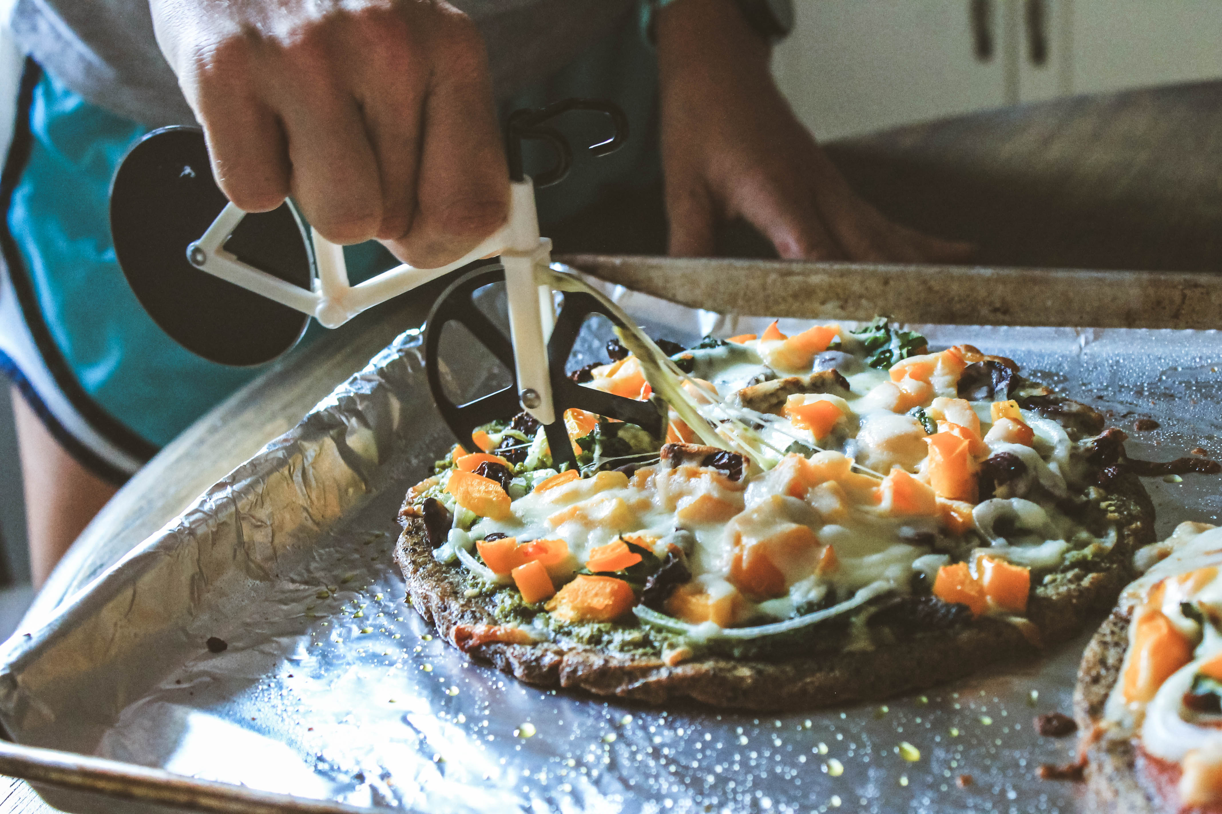 I use a round 9-inch cake pan to give my pizza a traditional, circular pizza shape. A round 9-inch cake pan will result in one personal pizza. I usually cook two at the same time; one for me and one for my husband and place the pans side by side in the oven. If you don’t have a round cake pan, you can use a similar sized square, rectangle, or other shape pan. If you do this, make sure not to use one too big or you will end up with super thin (and most-likely burnt) pizza crust. I’ve never tried doubling the recipe to make a large two person pizza, so if you try this you must tell me how it turns out!